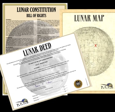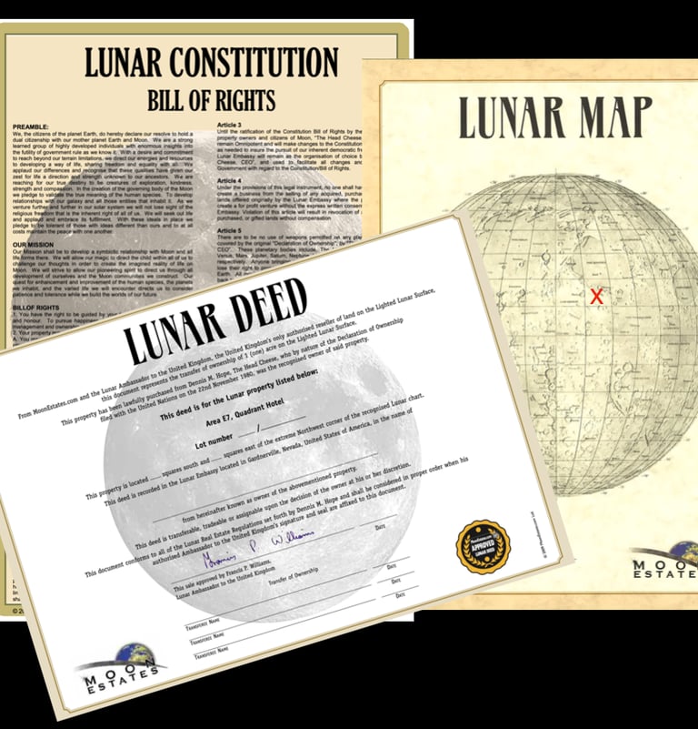 Lunar deed, map, mineral rights, bill of rights and welcome letter